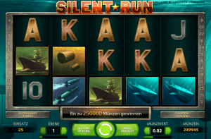 Der Spielautomat Silent Run von Net Entertainment, wird mit 5 Walzen und 25 Gewinnlinien gespielt und eignet sich sowohl für den kleinen, als auch für den großen Geldbeutel. Denn die Rundeneinsätze liegen bei dem auf Münzen basierenden Spiel, zwischen 0,25€ bis 125,00€ pro Dreh. Erscheint dir das Echo Bonus-Symbol irgendwo auf der 3ten Walze, werden zwischen 2 und 5 Torpedos mit Hilfe des Echolots auf den Walzen gefunden. Mit diesen gefundenen Torpedos, darfst du jetzt auf feindliche Schiffe schießen und kannst bis zu 250.000 Münzen dabei gewinnen.
